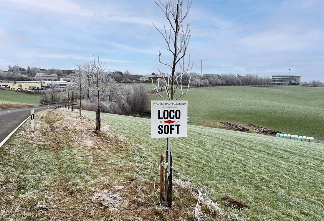 Firmengründer Wolfgang Börsch und Landwirt Jörg Lob einigten sich demnach auf eine "wachstumsstarke Kooperation": Während Lob mit tatkräftiger Unterstützung zahlreiche Helfer für das Einpflanzen der Bäume organisierte, übernahm Loco-Soft die Kosten für die 2,20 Meter hohen Setzlinge. Die aufwändige Pflanzaktion wurde vor kurzem abgeschlossen.