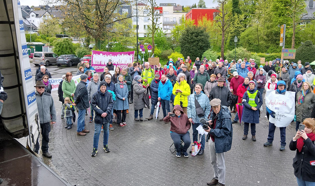 Der Aprilschauer war einigen Sonnenstrahlen gewichen, als sich der Demonstrationszug in Richtung Rathaus bewegte. Die Teilnehmer sangen auf dem Weg über die Hauptstraße, begleitet von einem Trommelspieler. Zur Freude der Veranstalter glückte anschließend die Menschenkette, sie schloss sich um das Rathaus und die Unterkunft für Geflüchtete.