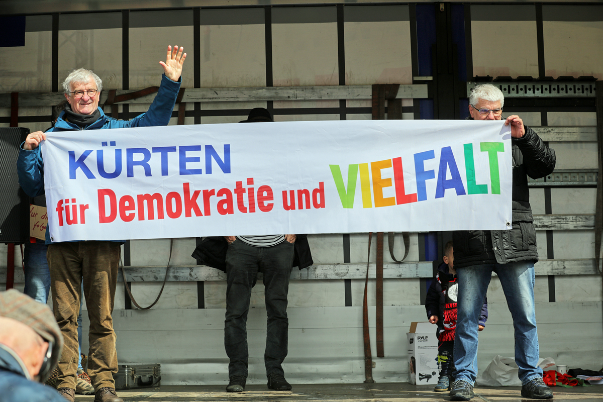 Ein Demoteilnehmer zitierte auf der Bühne einen Text von Erich Kästner, der schon 1958 gewarnt hatte: „Die Ereignisse von 1933 bis 1945 hätten spätestens 1928 bekämpft werden müssen. Später war es zu spät. Man darf nicht warten, bis aus dem Schneeball eine Lawine geworden ist. Man muss den rollenden Schneeball zertreten.“
