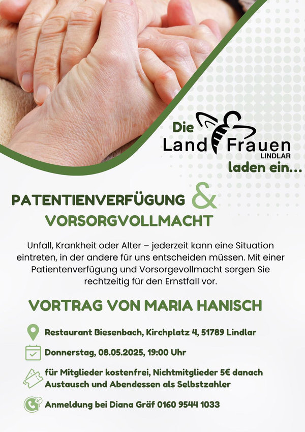 LINDLAR Patientenverfügung und Vorsorgevollmacht TEILEN Red; 28.04.2025, 20:23 Uhr Lindlar - Vortrag des Ortsvereins Lindlar der Landfrauen Oberberg am 8. Mai. WERBUNG