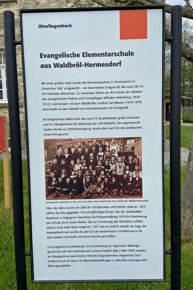 Ein Blick zurück: 1861 wurde die evangelische Volksschule eingeweiht. Sie bestand aus einem Klassenzimmer und einer Lehrerwohnung. Überlieferungen zufolge lernten hier oft über 100 Mädchen und Jungen auf engstem Raum gemeinsam. Komfort gab es nicht: Die Schulbänke waren funktional, die Tische schmal – geschrieben wurde auf Tafeln. Heute undenkbar. 1937 schloss die Schule. Sie wurde später in den Gebäudekomplex der Gemeinschaftsgrundschule Hermesdorf integriert.