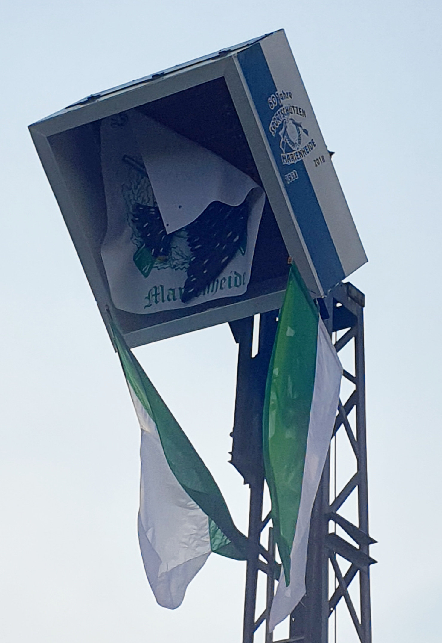 Abhilfe schaffte die örtliche Feuerwehr mit ihrem Hubsteiger und es herrschte wieder freie Sicht. Doch damit nicht genug: Nur wenige Minuten später brach ein Bolzen am Gewehr, sodass das Schießen erneut unterbrochen werden musste. „Schützenhilfe“ leisteten spontan die Grünröcke aus dem benachbarten Müllenbach und stellten eine Flinte zur Verfügung, mit der der 41-jährige Berufssoldat dem Vogel dann endgültig den Garaus machte. Der dreifache Vater, der mit seiner Familie im Heier Zentrum wohnt, regiert nun gemeinsam mit seiner Ehefrau Tatiana (38) die Marienheider Schützen. Er ist seit 25 Jahren im Verein und engagiert sich unter anderem als Chef der Fahnenträger.