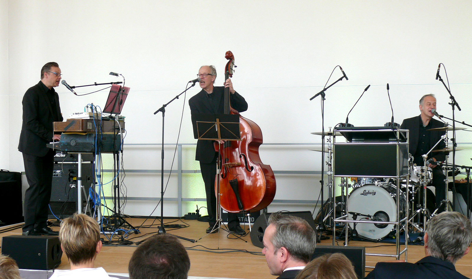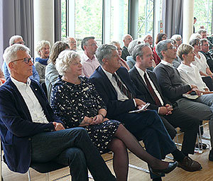 [Zusammen mit dem Publikum lauschten Bernd Hombach (Vorsitzender des Fördervereins, v. l.), Silke Engel, Prof. Dr. Friedrich Wilke, Kreisdirektor und Kulturdezernent Klaus Grootens und Stefan König den Carmina Burana Jazzversionen der Band Neuzeit.]