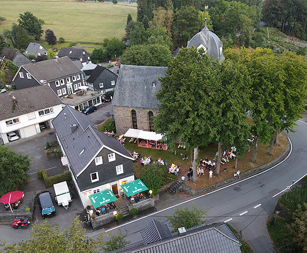 [Es herrscht ein tolles Ambiente im Hof zwischen Dorfkneipe und Kirche.]
