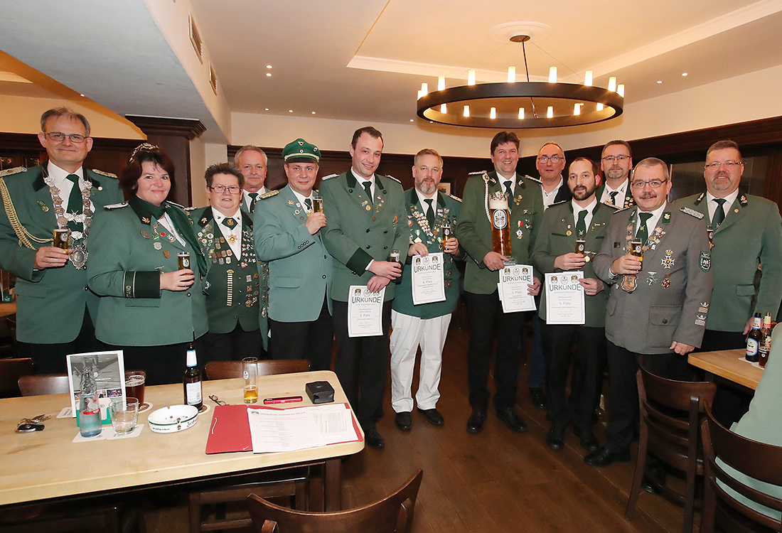 Der Pokal und damit der 1. Platz mit 500 € Preisgeld und 100 Liter Zunft Kölsch ging dieses Mal an den Schützenverein Pernze-Wiedenest. Den 2. Platz mit 400 € und 50 Litern Zunft Kölsch belegt der Schützenverein Vollmerhausen. Den 3. Platz mit 300 € und 30 Litern Bier erkämpfte sich der Schützenverein Lindlar. Den 4. Rang mit 200 € und 20 Litern holten sich die Grünröcke vom Schützenverein Waldbruch und den fünften Rang belegte der Schützenverein „Hohe Belmicke“, der 100 € Preisgeld, sowie 10 Liter Zunft Kölsch mit nach Hause nehmen darf. Neben dem Ausrichter aus Mühle-Niederseßmar waren die Vereine aus Steinenbrück, Eckenhagen, Brück-Dieringhausen, Ründeroth und Loope zur Feier im Braustübchen erschienen.