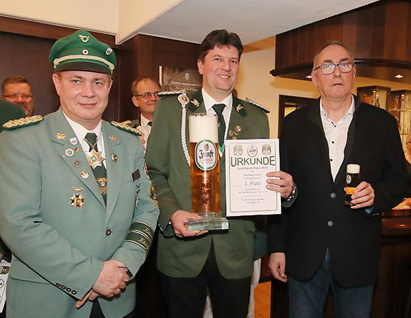 [Der Vorsitzende des Schützenvereins Pernze-Wiedenest, Frank Stoffel (Mitte), nahm den Siegerpokal von Klaus Büser (l.) und Udo Hülsmann entgegen.]