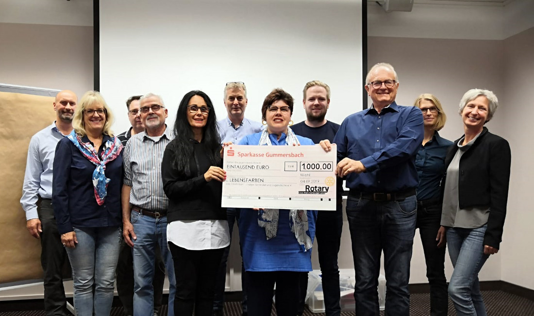 Kürzlich übergab der Rotary Club Wiehl-Homburger-Land einen Scheck über 1.000 € an den Verein Lebensfarben – Hilfen für Kinder und Jugendliche. Der Kontakt entstand aus einem Vortrag von Sandra Karsten und Rolf Trapp innerhalb der wöchentlich stattfindenden Treffen des Vereins. Schnell wurde die Idee geboren, den Spendenerlös des bevorstehenden Champagnerverkaufs beim Fest „Wein & Musik im Burghof“ in Bielstein zu spenden.