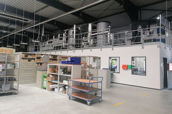 Einige Meter daneben befindet sich nun auch ein 30 Kubikmeter großer Eisspeicher – und damit eines der Highlights auf dem Betriebsgelände. Ergänzt wird dieser durch eine Luft-Wasser-Wärmepumpe, die der Umgebungsluft Wärme entzieht. Außerdem gibt es eine sogenannte Booster-Wärmepumpe, die Warmwasser bereitstellt. Die bisherige Gastherme bleibt ebenfalls in Betrieb. Im Logistikzentrum, wo die AggerEnergie über 7.000 unterschiedliche Artikel auf Lager hält, ist auch ein intelligentes Modul untergebracht, das laut Christian Lorenz entscheidet, welche Energiequelle zu einem bestimmten Zeitpunkt die Beste ist.