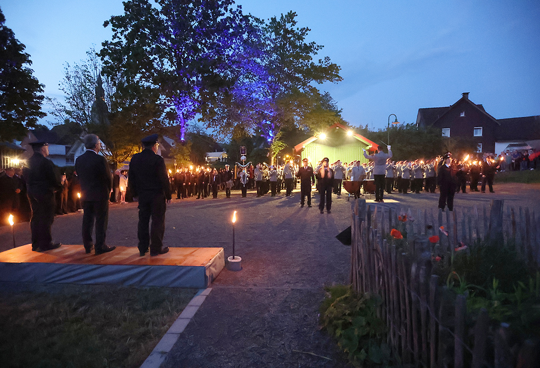 Gemeindebrandinspektor Sascha Frede nutzte die Gelegenheit, um besondere Ehrungen, Übernahmen und Beförderungen innerhalb der Freiwilligen Feuerwehr Eckenhagen-Hespert vorzunehmen. Er bat diejenigen auf die Bühne, die sich durch ihre langjährige und herausragende Mitarbeit besonders verdient gemacht hatten. Den festlichen Abschluss bildete ein beeindruckender Zapfenstreich, der am Bauernhofmuseum stattfand. Angeführt vom Musikverein Frenkhausen unter der Leitung von Patrick Müller gingen die Gäste schließlich vom Festzelt aus los.