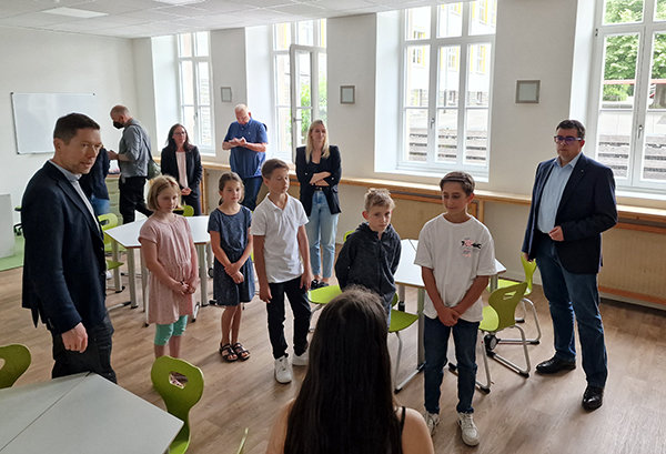 Es bietet nun auf drei Etagen Gruppenräume, darunter eine Bibliothek für die Schüler, einen Speiseraum mit einer Küche, einen Besprechungsbereich mit einer „Chill-out Area“ für das Lehrpersonal und zwei Büros. Neben dem Öffnen mehrerer Wände, der Schaffung von Fluchtwegen und der Erneuerung des Brandschutzes musste auch eine Fluchttreppe an das Gebäude angebaut werden. Nicht ohne Stolz zeigten die Grundschüler Bürgermeister Frank Helmenstein und dem 1. Beigeordneten der Stadt Raoul Halding-Hoppenheit die neuen Räume am Freitagvormittag.
