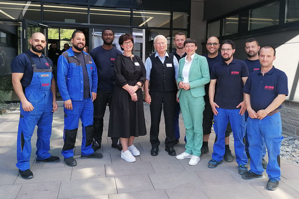[Personalleiterin Cornelia Gerhard (4.v.l.), ONI-Chef Wolfgang Oehm und Ministerin Josefine Paul zusammen mit geflüchteten Menschen, die bei ONI ihre berufliche Heimat gefunden haben.]