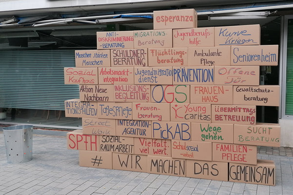 Um auf die Probleme in der Wohlfahrts- und Sozialarbeit aufmerksam zu machen, sind am Vormittag rund 100 Mitarbeiter aus diversen Einrichtungen der Caritas durch die Innenstadt gezogen. Zum Großteil in schwarz gekleidet, gingen die Demonstrierenden in einem Trauerzug von der Wilhelmstraße zur Alten Rathausstraße und der Kaiserstraße hin zum Lindenplatz und über die Moltkestraße zurück zur Wilhelmstraße. Vorneweg trugen sie einen Sarg.
