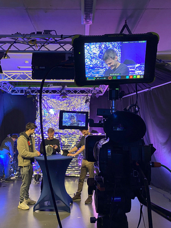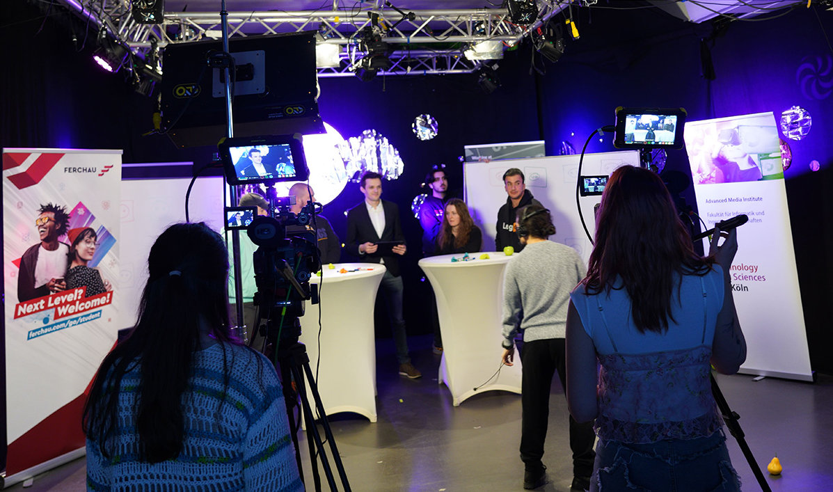 Ob die Blickrichtungen, die Höhe der Kamera, das Licht, der Nebel, das Szenenbild mit der Werbung, Einblendungen oder auch Überblendungen: Bei den finalen Proben am gestrigen Donnerstag bekamen die Studierenden von Prof. Hans Kornacher noch einige Tipps. Das Ergebnis ist in rund einer Woche auf dem Twitch-Kanal der Medieninformatik der TH Köln zu sehen. Gestreamt wird die Spielshow „Dream ITeam“ von den Studierenden am Donnerstag, 30. Januar. Wer sich die Show ansehen möchte, kann dazu hier klicken. Der Livestream startet um 18 Uhr.