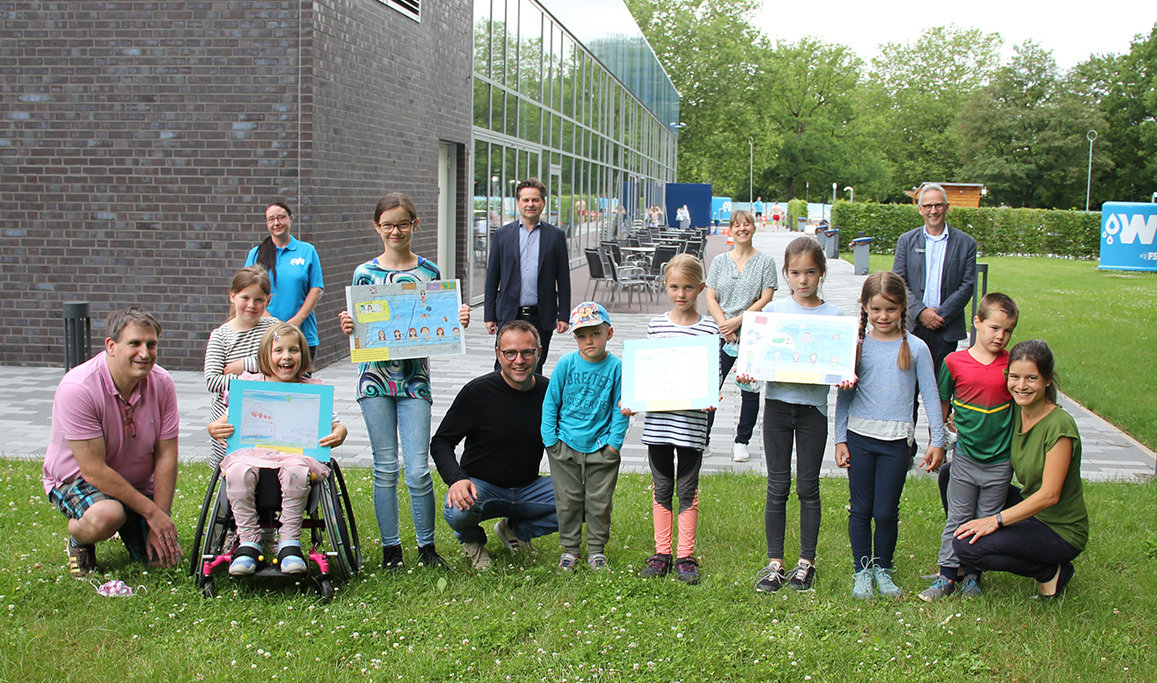 Den ersten Preis – unter anderem einen 30-Euro-Gutschein samt Handtuch - vergab die Jury an Emmi Dross (11). Sie hat das Schwimmbecken im Freibad mit Wasserfarben gemalt, in dem sie gerne mit ihrer Familie und ihren Freunden schwimmt. Emmi freute sich vor der Öffnung aber nicht nur aufs Schwimmen. „Auch der Kiosk ist cool.“ Den zweiten Platz – unter anderem einen 20-Euro-Gutschein - belegte Ida Rothe (8). Sie hat das Freibad gemalt, das sie häufig mit ihrer Oma besucht. Den dritten Platz (unter anderem jeweils einen Zehn-Euro-Gutschein) teilten sich Ella Dross (9), die Schwester der Siegerin, und Ida H. (7). Ella malte das Freibad-Becken und eine Sprechblase, in der eine Portion Pommes zu sehen ist. Ida hat ein Schwimmbad mit ihrem eigenen Rollstuhl-Parkplatz gemalt mit der Frage: „Hi Corona. Kannst du schwimmen?“