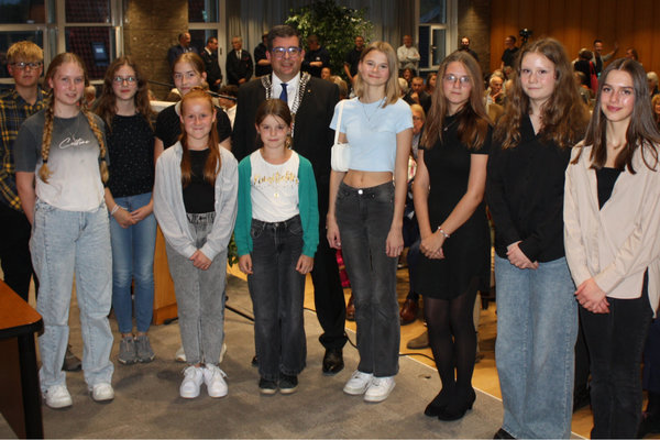 [Die Gewinner des Schüler-Kunstwettbewerbs „ Das sind wir! - 55 Jahre LRSY—GM“ strahlten mit Bürgermeister Helmenstein um die Wette.]