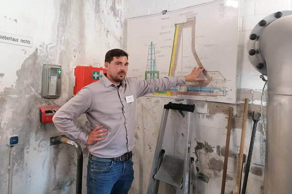 [Betriebsleiter Lars Hebbecker hat vor einem Schaubild erklärt, wie die Staumauer aufgebaut ist.]