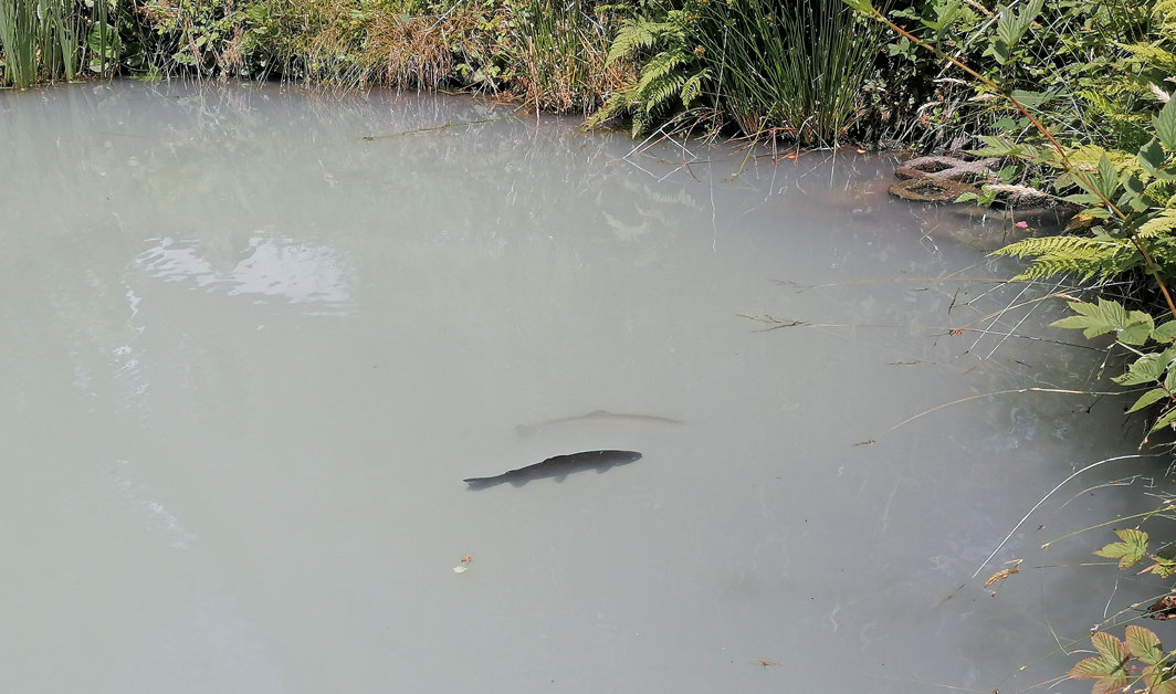 15 Regenbogenforellen haben Karin und Joachim Peucker in diesem Frühjahr in ihren Teich eingesetzt, doch gesehen haben sie die Fische schon seit zwei Wochen nicht mehr. Seitdem ist das Wasser des Teichs trüb, der Grund nicht mehr zu erkennen – eine „Milchsuppe“, wie Peucker sagt. „Das tägliche Füttern entfällt. Darauf reagieren sie seitdem nicht mehr.“ Lediglich zwei Forellen zeigten sich in dieser Woche wieder an der Wasseroberfläche: während eine von beiden mittlerweile wieder frisst, scheint der andere Fisch erblindet zu sein. Er kann sich nicht orientieren, schwimmt immer wieder gegen die Begrenzungen des Teiches.
