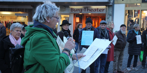 Mehr als 30 Bürger haben sich am gestrigen Tag der Menschenrechte vor der Alten Vogtei in der Fußgängerzone versammelt, um alle 30 Artikel der Reihe nach zu verlesen. Die Aktion wurde unter anderem von Gerhard Jenders (Unser Oberberg ist bunt) und dem ehemaligen Stadtrat Lothar Winkelhoch initiiert. „Überall bröckeln die Menschenrechte, überall auf der Welt wird gegen sie verstoßen“, sagen beide. Im Ausland würden Menschen mit einer Selbstverständlichkeit ermordet, auch von Regierungen. Aber auch in Deutschland gebe es Probleme, zum Beispiel wenn Menschen das Recht auf Asyl verweigert werde. Deshalb seien die Menschenrechte gerade in dieser schwierigen Zeit wichtiger denn je. „Die Menschenrechte sind eine Errungenschaft, auf die die Menschen stolz sein können.“