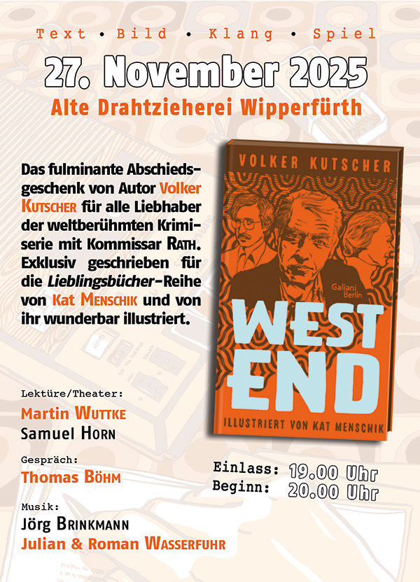 Die Alte Drahtzieherei lädt ein zu einem Abend, an dem Literatur, Musik und Illustration verschmelzen sollen. Der vielfach ausgezeichnete Autor Volker Kutscher, in Lindlar geboren und in Wipperfürth aufgewachsen, und die Illustratorin Kat Menschik präsentieren am Donnerstag, 27. November, ab 20 Uhr in der Alten Drahtzieherei ihren neuen Band „Westend“ – das Abschiedsgeschenk an alle Fans der Gereon-Rath-Reihe.