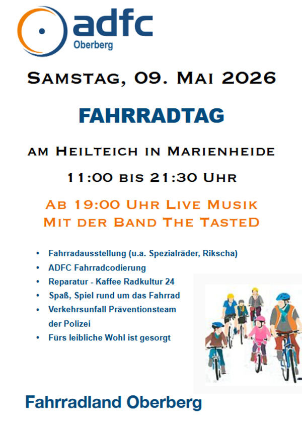 Der ADFC Oberberg lädt auf Samstag, 9. Mai, zum Heilteich in Marienheide zur Premiere des kreisweiten "Tag des Fahrrads" ein. Los geht es um 11 Uhr, Landrat Klaus Grootens und Bürgermeister Sebastian Heimes werden die Veranstaltung eröffnen. Bis 18:30 Uhr gibt es ein buntes Angebot an Info-Ständen, Spiel und Spaß rund ums Rad und auch die Polizei wird vor Ort sein. Ab etwa 19 Uhr spielt die Band The Taste ein Livekonzert.