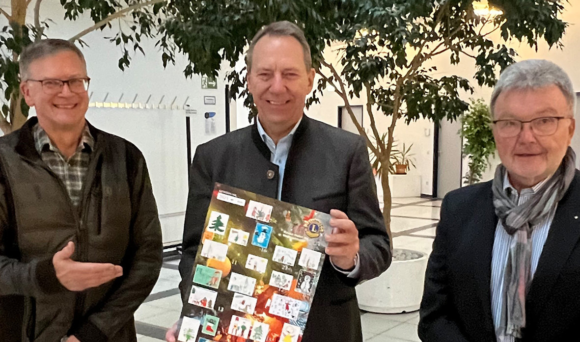 Landrat Jochen Hagt freute sich gestern, in guter alter Tradition den ersten von insgesamt 8.000 Lions Club-Adventskalendern in Empfang zu nehmen. Seit 2005 gibt es die Aktion der drei in der Kreisstadt ansässigen Wohltätigkeitsvereine, in diesem Jahr obliegt die Organisation beim Lions Club Gummersbach. Hilfswerk Vorsitzender Dr. Dieter Borchers war neben Clubpräsident Dr. Christian Rogos ins Kreishaus gekommen, um das diesjährige Projekt vorzustellen.