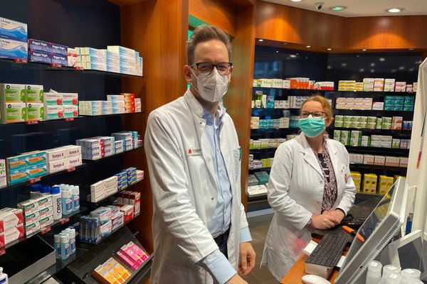 Einige Meter weiter betreibt Sebastian Gissinger die Hirsch-Apotheke und ist dort einer von 16 Mitarbeitern des elterlichen Unternehmens. In den Verkaufsraum (ebenfalls 60 Quadratmeter) dürfen per se nur drei Kunden gleichzeitig eintreten, auch wenn rein rechtlich mehr zugelassen wären. „Wir haben keine Laufkundschaft, die sich in Verkaufsregalen umschauen“, so der Apotheker. Die meisten Kunden sind erkrankt und werden deswegen bereits am Eingang mit einem Stopp-Banner zum Warten aufgefordert. Jeweils nach Aufforderung bittet man sie zu einem der drei Beratungsplätze. Dort sind zusätzlich Plexiglasscheiben verbaut. Penibel achten die Mitarbeiter auf Einhaltung der Regeln.