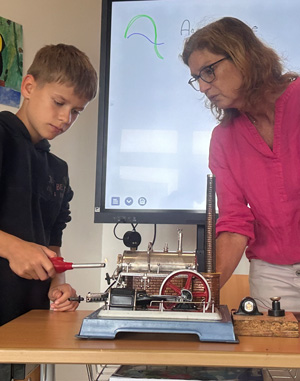 Louis aus der Klasse 4b an der Grundschule Müllenbach feuert grade einen Grillanzünder an, um das Wasser in der Miniatur-Dampfmaschine von Stephanie Scheunemann zum Kochen zu bringen. Bis es so weit ist, zeichnet die Referentin der „Deutschen Umwelt-Aktion“ aus Leverkusen auf dem White Board im Klassenraum ein Kohlekraftwerk und erklärt Louis und seinen Mitschülern aus der 4b die ursprüngliche Form der Stromerzeugung, wie sie vor knapp 200 Jahren von James Watt entdeckt wurde. Ab dem Siedepunkt verrichtet die Dampfmaschine tatsächlich ihren Dienst und bringt eine kleine Lampe nach dem Dynamoprinzip zum Leuchten.