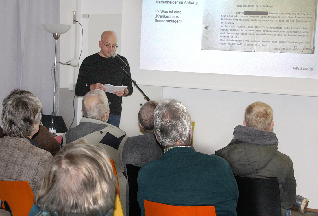 Durch berufliche Verknüpfungen seiner Familie zum sogenannten „Lazarett“ wurde Huppertz´ privates Interesse an weiteren Nachforschungen zur „Einrichtung der letzten Phase der Euthanasie“ und der Person des Karl Brandt geweckt. Ausführlich beleuchtete der Referent den Ursprung und die kontroverse, wissenschaftliche Diskussion um die Euthanasie, für die Nationalsozialisten das ideale Instrument zum Zwecke der „Rassenhygiene“ und der „Gesunderhaltung und Reinigung des deutschen Volkskörpers“.