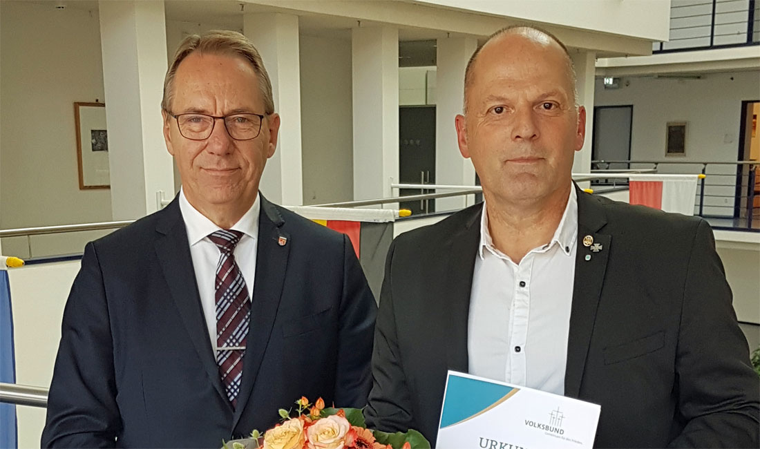 Oberberg – Jan Boris Hausmann unterstützt seit Jahren die Haus- und Straßensammlung des Volksbundes Deutsche Kriesgsgräberfürsorge und wurde nun vom Landrat für sein Engagement geehrt.