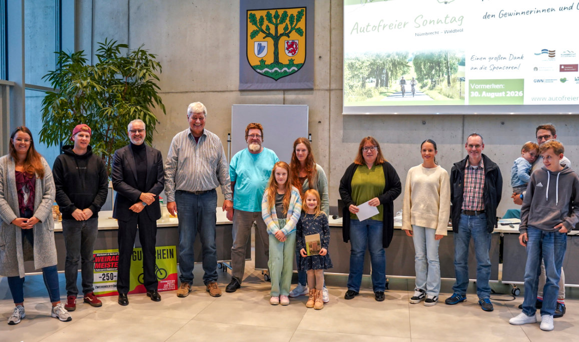 Im Bürgersaal des Waldbröler Rathauses fand die Verlosung zum 21. Autofreien Sonntag in Nümbrecht und Waldbröl statt. Unter den rund 950 vollständig ausgefüllten Teilnahmekarten wurden insgesamt 22 Gewinner ermittelt – zehn Kinder, elf Erwachsene und eine Gruppe. Die Veranstaltung am 31. August hatte knapp 2.000 Teilnehmer auf die Strecke gelockt.