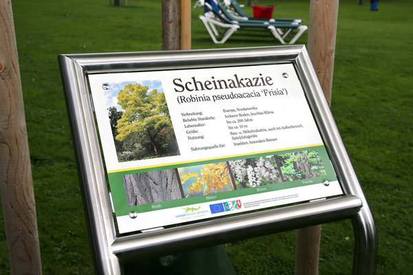 [Von Schülern der Sekundarschule mitgestaltete Schilder vermitteln die wichtigsten Fakten zu den einzelnen Baumarten.]