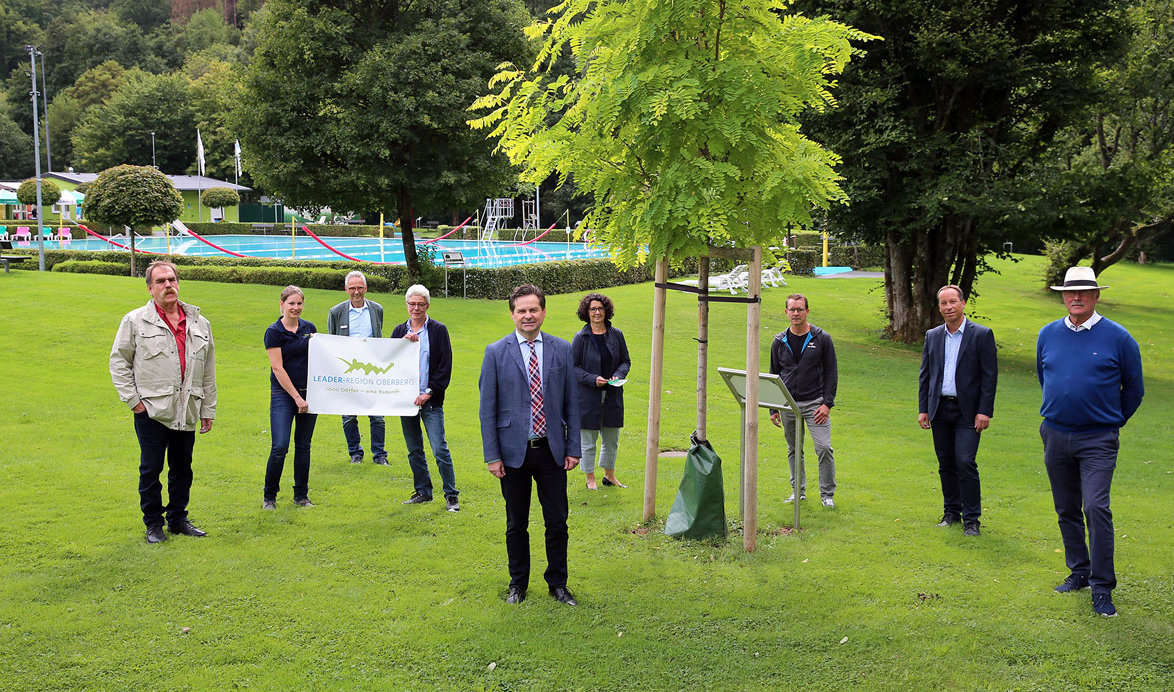 Frank Herhaus, Dezernent für Planung, Regionalentwicklung und Umwelt beim Oberbergischen Kreis, wies bei der „Eröffnungsfeier“ auf die LEADER-Region Oberberg hin. Das Förderprogramm wurde aus Mitteln der Europäischen Union entwickelt, um ländliche Gebiete zu stärken. Von den rund 25.000 € Gesamtkosten des Projekts kommen etwa 16.000 € aus dem LEADER-Topf. Der Förderverein des Freibads hat die weiteren Kosten getragen und möchte mit dem Baumlehrpfad sein Konzept „Fit und gesund“ erweitern.