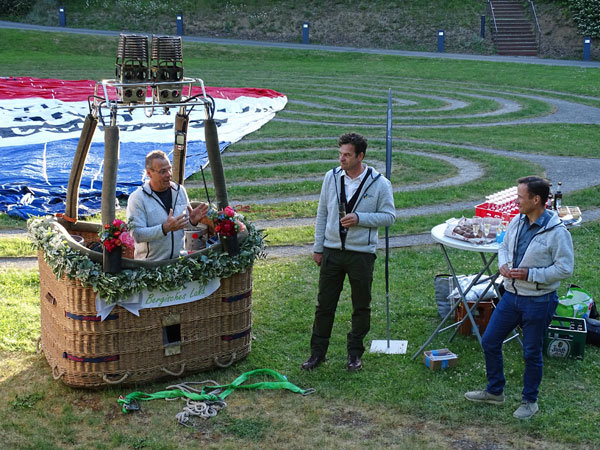 [Ballontaufe auf dem Gelände von Schloss Homburg: Thomas Lepperhoff (Ballon-Sport-Club Reichshof, v.li.), Jens Eichner (Geschäftsführer Naturpark Bergisches Land) und Tobias Kelter (Geschäftsführer Naturarena Bergisches Land).]