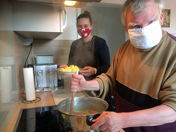 [Gemeinsames Kochen mit Mundschutz: Unter anderem durch Kochaktionen geben die HBW-Mitarbeitern den Menschen mit Behinderung eine Tagesstruktur.]
