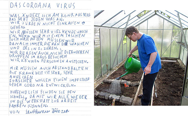 [Stephanus Dünzer, Bewohner des Hauses am Konradsberg, bei der Gartenarbeit. Den Garten und die Gemeinschaftsräume dürfen die Bewohner nur gruppenweise betreten, um das Ansteckungsrisiko zu minimieren - Das Coronavirus erklärt er mit seinen Worten und hofft bald wieder in die Werkstatt zu dürfen.]