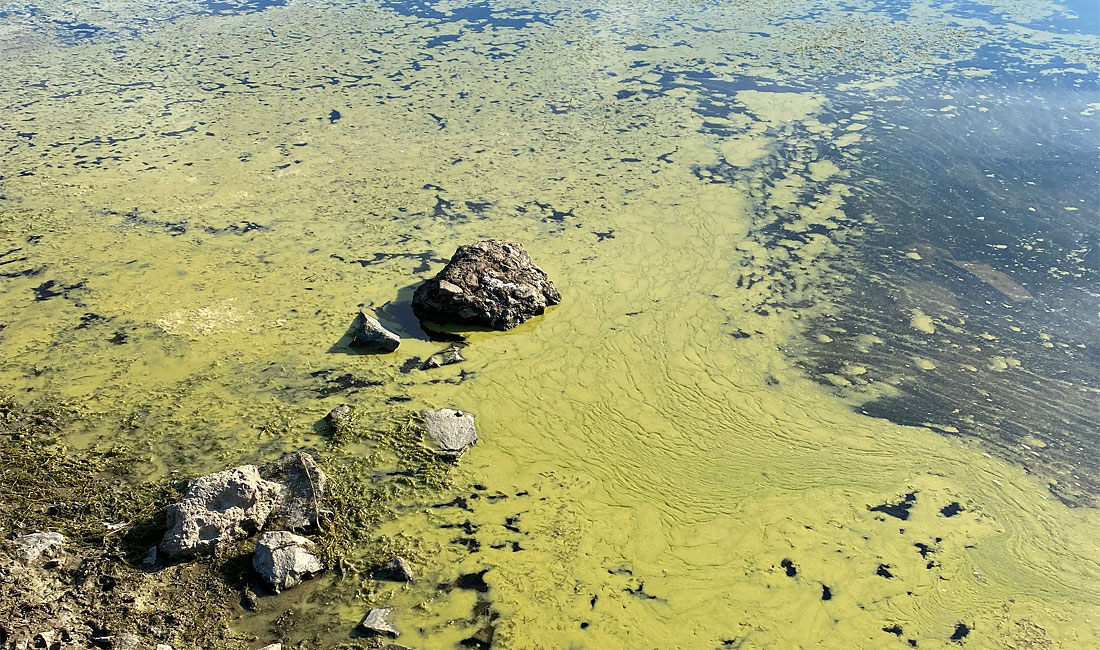 • Ein erstes Zeichen für die Bildung von Blaualgen ist eine geringe Sichttiefe durch eine starke Trübung des Wassers.