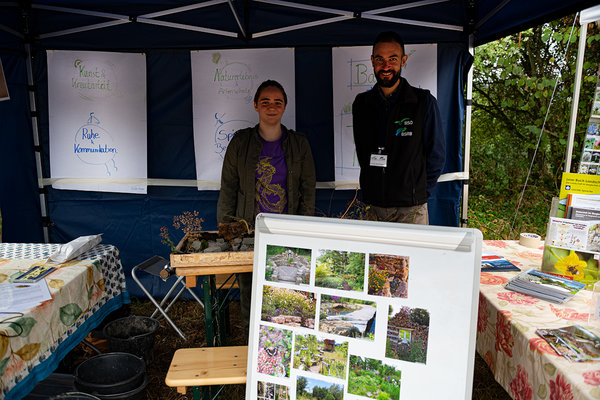 Dass der Stand der Biologischen Station Oberberg genau neben dem des Naturgartenvereins steht, ist kein Zufall, denn beide werden gemeinsam ab Herbst hier einen Naturgarten, zu dem Workshops angeboten werden. „Das passt genau in die Umweltbildung des Freilichtmuseums“, so Florian Schöllnhammer, der gemeinsam mit FÖJlerin Lara Knebel Kindern die Möglichkeit gibt, ihren Naturgarten schon einmal in klein zu bauen.