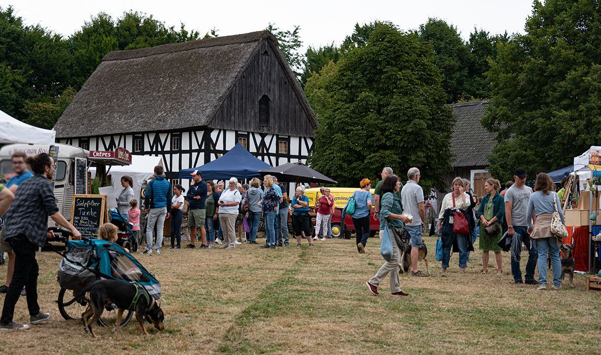 Mitmachen konnten die kleinen und großen Besucher auch jetzt schon an verschiedenen Stationen. Beim Buttermachen oder Dreschen beispielsweise. Oder es konnten Duftsäckchen hergestellt werden mit Rosen- oder Lavendelblüten. Kleine Schafsteine hatte Hagen Fach von der Eichenhof-Schäferei dabei, deren Erlös in die Ukraine geht. Viel zu sehen, zu erleben und mitzunehmen beim Bauernmarkt. Am 2. Oktober findet im Freilichtmuseum wieder das „Obstwiesenfest“ statt sowie zwei Wochen später – am 16. Oktober – das „Äepelsfess“.