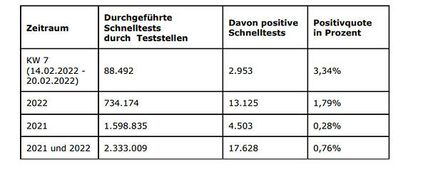 Die Zahl der durchgeführten Corona-Bürgertests in der Region lag in der vergangenen Kalenderwoche (14. bis 20. Februar) bei 88.492 – im Vergleich zur Woche davor ein spürbarer Rückgang (101.323). Nach Angaben der Kreisverwaltung waren 2.953 Tests positiv, was einer Quote von 3,34 Prozent entspricht und abermals einen neuen Höchstwert seit Beginn der Bürgertestungen im März 2021 darstellt (Vorwoche: 2.983 positive Schnelltests, Quote: 2,94 Prozent).