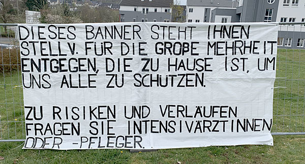 „Wir sind sehr stolz, dass die widerliche Propaganda der Querdenker in Lindlar fast keine Resonanz findet. Dass die überwältigende Mehrheit der Lindlarer dem Aufruf zur Demo nicht gefolgt, sondern zuhause geblieben ist, ist ein starkes Zeichen der Vernunft, der Solidarität und des Respekts gegenüber den inzwischen fast 80.000 Corona-Toten alleine in Deutschland. Vielen Dank Lindlar“, erklärte Ortsverbandssprecher Ingo Harnischmacher für die Lindlarer Grünen. Auch die Pfarrjugendleitung der Kartholischen Jungen Gemeinde Lindlar machte ihrem Unmut Luft. Man verurteile scharf, wenn mit Hilfe einer Telegram-Gruppe, in der der Holocaust verharmlost und rechtsradikale Fake-News verbreitet würden, eine Demonstration organisiert werde, um auf dem Rücken von Kindern seine Corona-Zweifel kund zu tun, hieß es seitens der KJG.