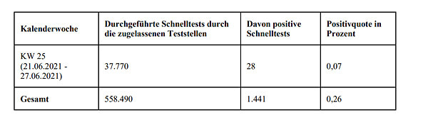 558.490 Schnelltests wurden bis Sonntag, 27. Juni, in den 159 Teststellen im Oberbergischen durchgeführt, wie die Kreisverwaltung heute mitteilte. In der vergangenen Woche waren es 37.770. 28 davon waren positiv. Das entspricht einer Quote von 0,07 Prozent. Hier ist eine tabellarische Übersicht zur Entwicklung der durchgeführten Schnelltests in den vergangenen Wochen zu finden.