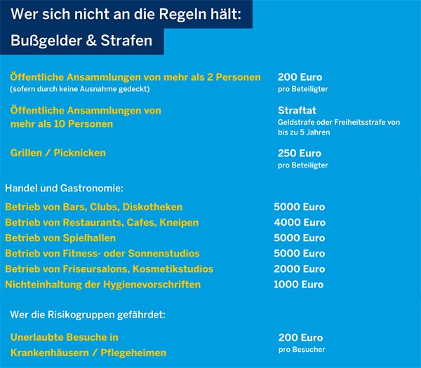 Zur Umsetzung des Kontaktverbots hat die Landesregierung einen Straf- und Bußgeldkatalog veröffentlicht. Grundlage ist das Infektionsschutzgesetz. Damit sollen Infektionen vermieden und die Ausbreitung des Coronavirus verlangsamt werden. Der Katalog enthält eine Übersicht, welche Verstöße als Straftaten und welche als Ordnungswidrigkeiten zu ahnden sind. Strafbar machen sich demnach beispielsweise Rückkehrer aus Risikogebieten, die vorsätzlich oder fahrlässig gegen Betretungsverbote, etwa in Altenheimen, verstoßen. Als Straftat gelten ebenso Ansammlungen in der Öffentlichkeit, bei denen mehr als zehn Personen zusammenkommen. Wer vorsätzlich oder fahrlässig gegen das Verbot verstößt, öffentliche Veranstaltungen oder Versammlungen durchzuführen, macht sich ebenfalls strafbar. Ebenso aufgeführt sind Ordnungswidrigkeiten und die dazugehörigen Bußgelder.