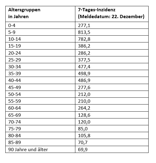 In Oberberg bleiben die Inzidenzen in den jüngeren Altersgruppen besonders hoch. Die Spitzenwerte werden bei den Fünf- bis Neunjährigen (813,5) und den Zehn- bis 14-Jährigen (782,8) erreicht, wobei die Zahlen seit November insgesamt zurückgegangen sind (Quelle: Landeszentrum Gesundheit NRW). Auch die Gruppen zwischen 25 und 44 Jahren weisen Inzidenzen auf, die über dem Durchschnitt im Kreis liegen, während das Infektionsgeschehen bei den älteren Menschen moderater ist.