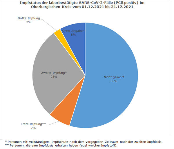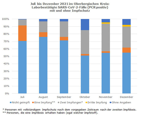 Im Jahr 2021 verstarben 215 Oberberger, die zuvor positiv auf SARS-CoV-2 getestet worden waren. Das Durchschnittsalter der Verstorbenen liegt bei 78 Jahren. Der Großteil der verstorbenen Personen hatte laut Gesundheitsamt schwere Vorerkrankungen. Eine aussagekräftige Auswertung zum Impfstatus für das gesamte Jahr 2021 könne nicht durchgeführt werden, da der Status aufgrund von sich ändernden Landesvorgaben nicht von Beginn an systematisch erfasst worden sei. Im November waren von den verstorbenen Personen 80 Prozent ungeimpft, so der Kreis. Im Dezember verstarben 36 Oberberger, die zuvor positiv auf SARS-CoV-2 getestet worden waren. Davon waren 39 Prozent nicht geimpft. 14 Prozent hatten eine erste Impfung, 19 Prozent eine zweite Impfung und drei Prozent waren geboostert. Bei 25 Prozent ist der Impfstatus unbekannt.