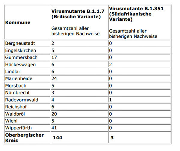Seit der letzten Mitteilung der Kreisverwaltung am Mittwoch sind 32 neue Fälle der britischen Virusmutante B.1.1.7 in Oberberg bestätigt worden, die Gesamtzahl seit dem ersten Nachweis Anfang Februar stieg auf 144. Neun weitere Fälle gab es in Wipperfürth, deren acht in Waldbröl. Auch in Marienheide (6), Engelskirchen, Gummersbach und Wiehl (jeweils 2) sowie in Bergneustadt, Lindlar und Morsbach (jeweils 1) wurden weitere Ansteckungen mit der Mutante B.1.1.7 registriert. In Hückeswagen haben sich laut Kreis zwei Personen mit der südafrikanischen Variante B.1.351 infiziert.