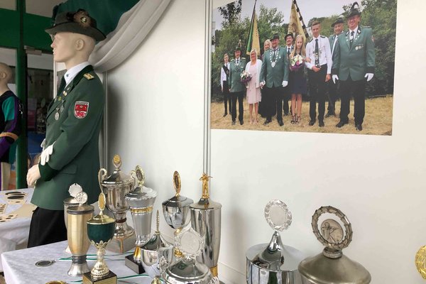 Das Schützenwesen soll nicht in Vergessenheit geraten. Deswegen hat man bei den Marienheider Grünröcken eine besondere Aktion entwickelt und in die Tat umgesetzt. Da man in der Gemeinde etwas gegen den Ladenleerstand unternehmen wollte, entstand die Idee zu einer Ausstellung im Schaufenster des Geschäftshauses in der Leppestraße 7b. Zu sehen sind dort historische Stücke des 1928 gegründeten Vereins wie eine Schützenmütze aus den 1960er Jahren, diverse Pokale sowie Königsvögel oder eine Schützenjacke. Eine Fotowand mit Motiven aus Vergangenheit und Gegenwart dokumentieren das Vereinsleben in Marienheide. Illuminiert wird das Schaufenster in den Abendstunden mit grün-weißem Licht.