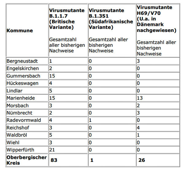 Seit der letzten Mitteilung der Kreisverwaltung am vergangenen Freitag sind elf weitere Fälle der britischen Virusmutante B.1.1.7 bestätigt worden: drei in Wipperfürth, wo es die meisten Ansteckungen gibt, jeweils zwei Fälle in Hückeswagen und Radevormwald sowie jeweils einer in Engelskirchen, Gummersbach, Nümbrecht und Waldbröl. Insgesamt wurde die britische Variante inzwischen 83-mal im Oberbergischen nachgewiesen.