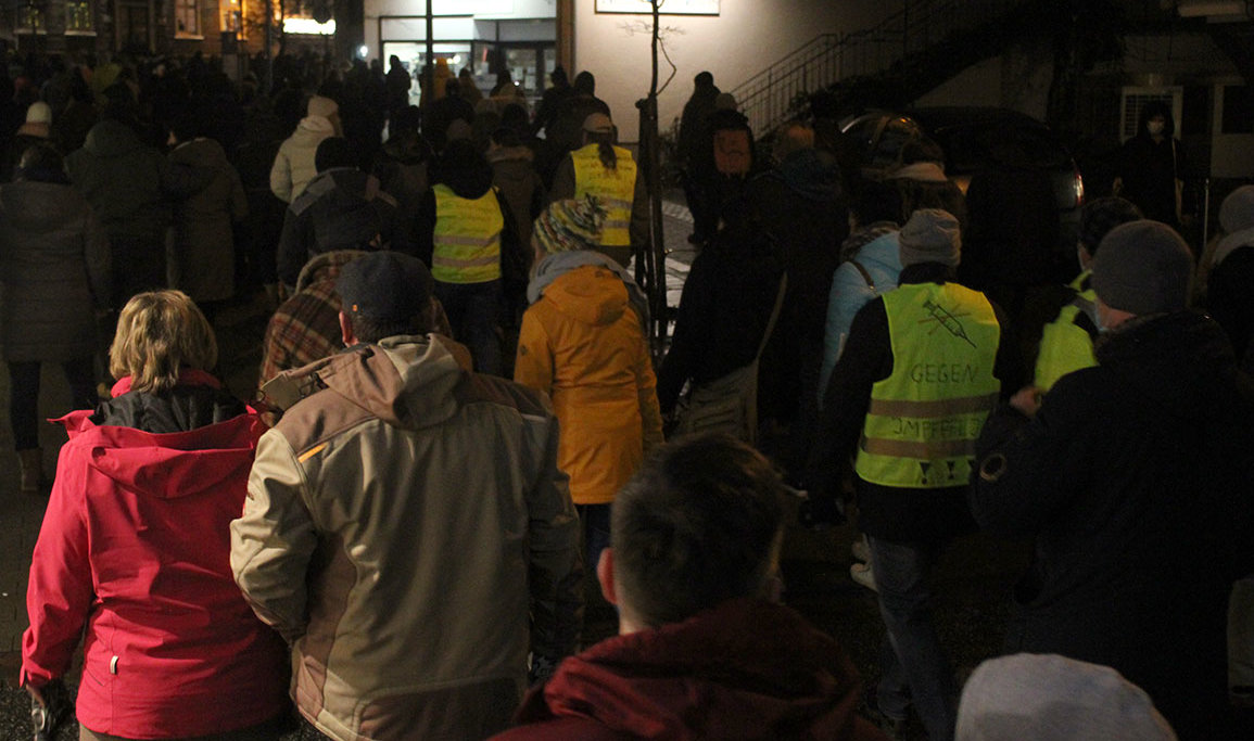 Obwohl der Protestzug in dieser Woche letztlich nicht angemeldet war, sind in Gummersbach laut Polizei etwa 1.300 Menschen erneut auf die Straße gegangen, um gegen eine Impfpflicht oder die Corona-Maßnahmen zu demonstrieren. Statt wie in der vergangenen Woche auf der Wilhelm-Heidbreder-Straße sammelten sich die Menschen erneut vor dem Kino auf dem Steinmüllergelände. So startete der Zug wieder durch das Nadelöhr Kampgasse am Forum. Zu diesem Zeitpunkt hielten sich schätzungsweise lediglich ein Viertel an die Maskenpflicht. Erst nach Lautsprecherdurchsagen durch das Gummersbacher Ordnungsamt zogen einige noch ihre Masken hoch, sodass knapp mehr als die Hälfte der Teilnehmer dieser Pflicht nachkamen. Das Ordnungsamt sprach von etwa einem Drittel, das keine Masken trug.