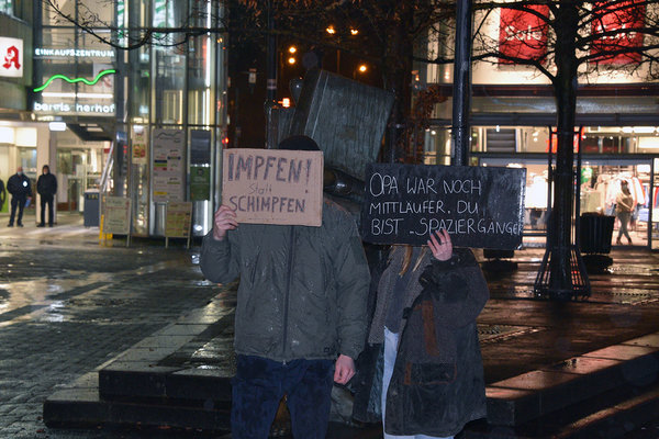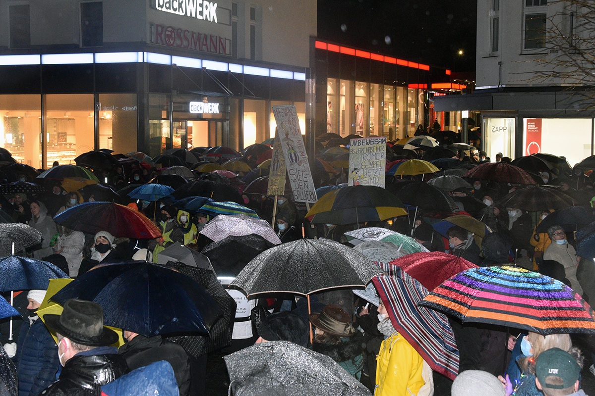 Zum zehnten Mal gingen am Montagabend Menschen gegen die Impfpflicht in der Gummersbacher Innenstadt auf die Straße. 800 Teilnehmer zählte die Polizei während der Demonstration – 300 weniger als in der Vorwoche. Ein Gegenprotest war nicht angemeldet worden, zumindest zwei junge Menschen positionierten sich aber erneut vor dem Gummersbacher Impfzentrum und hielten den Kritikern der Corona-Maßnahmen zum stillen Protest ihre Plakate entgegen.