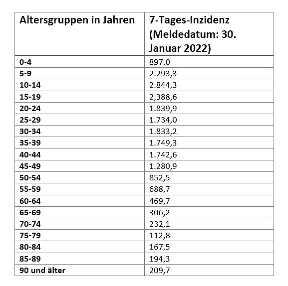 Die Inzidenzen in den einzelnen Altersgruppen erreichen inmitten der Omikron-Welle zum Teil irrwitzige Werte. Auf die einzelnen Altersbereiche bezogen, sind die Zahlen bei den jüngeren Menschen besonders hoch – in den Gruppen der Fünf- bis 19-Jährigen liegen sie inzwischen zum Teil deutlich über Marke von 2.000. Der Höchstwert wird bei den 10- bis 14-Jährigen erreicht (2.844,3). Unter dem Durchschnitt liegen die Werte in den Gruppen ab 50 Jahren, wobei sie mit zunehmendem Alter kontinuierlich sinken, ehe bei den Personen ab 80 Jahren wieder ein Anstieg zu beobachten ist.